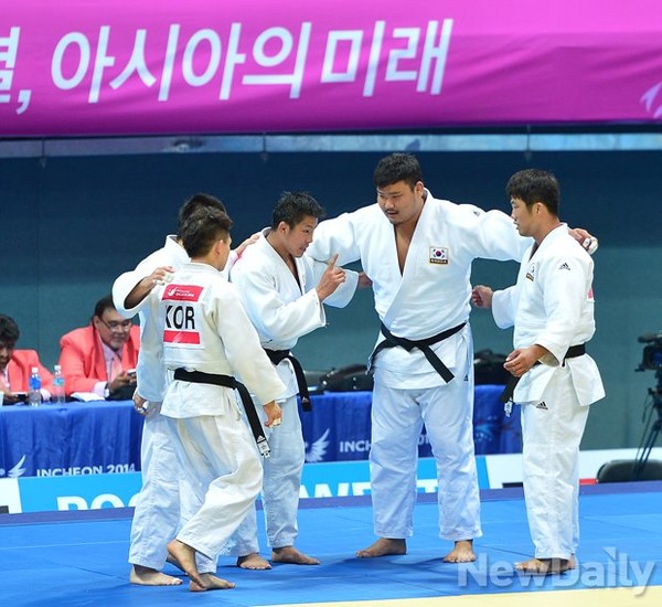 23일 오후 인천 도원체육관에서 열린 [2014 인천 아시아경기대회] 남자 유도 단체전에서 대한민국 대표팀은 몽골을 상대로 5-0으로 승리를 하며 결승에 진출해 은메달을 확보했다. 여자 유도 단체전 경기도 몽골을 상대로 3-2로 승리해 결승에 진출했다.