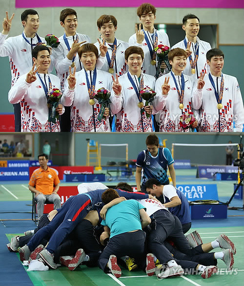 한국 남자 배드민턴 대표팀이 중국을 넘고 12년 만에 단체전 금메달을 목에 걸었다.한국은 23일 인천 계양구 계양체육관에서 열린 2014 인천 아시안게임 남자단체전 결승에서 중국을 3-2로 꺾고 이번 대회 배드민턴에서 첫 금메달을 따냈다.한국은 앞서 열린 준결승에서 대만을 3대0으로 가볍게 눌렀고, 중국 역시 말레이시아를 3대0으로 꺾고 결승에 진출했다.이날 대표팀은 첫 경기에서 손완호가 중국 첸 룽을 2-1로 눌렀으며, 2경기에서는 이용대-유연성 조가 수첸-장난 조를 2-0으로 제압했다. 이어 이동근이 린단에게 0-2, 김사랑-김기정 조가 차이윈-푸하이펑 조에 1-2로 각각 패해 역전 위기에 몰렸다.하지만 마지막 5경기 단식에 나선 이현일은 가오후안을 상대로 2-0으로 꺾으면서 3-2 짜릿한 승리를 차지했다.이로써 2006년 도하와 2010년 광저우 대회에서 잇따라 만리장성 중국에 가로 막혔던 한국 남자 배드민턴 대표팀은 12년 만에 금메달을 획득했다. 남자 단체 대표팀은 지난 2002년 부산 아시안게임에서 인도네시아를 누르고 우승했지만, 도하와 광저우 아시안게임에서는 잇따라 중국에 패해 은메달에 그친 바 있다.[배드민턴 남자 단체전 금메달, 사진=연합뉴스]