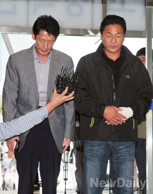 지난 17일 새벽 여의도에서 대리운전 기사와 말리던 시민 2명을 폭행한 혐의를 받고 있는 세월호가족대책위 [김병권] 위원장과 [김형기] 전 수석부위원장이 25일 오후 서울 영등포경찰서에 대질 심문을 받기 위해 출석하고 있다.