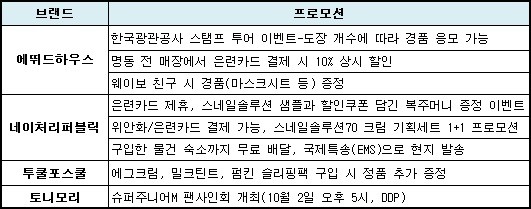 중국 최대 연휴인 국경절(10월 1일~7일)과 인천아시안게임을 앞두고 중국 관광객의 방문이 더욱 늘어날 것으로 보이는 가운데 화장품 업계가 분주하게 움직이고 있다.<한국관광공사>는 이번 국경절 기간 동안 지난해 보다 35% 이상 증가한 16만 명의 관광객이 찾을 것으로 전망하면서 침체된 시장에 더욱 활기가 될 것으로 예상하고 있다.이에 따라 중국 관광객이 많이 찾는 명동, 동대문 등을 중심으로 매장을 운영하고 있는 화장품 로드숍은 중국 관광객 맞이에 한창이다.네이처리퍼블릭 측은 “많은 중국 고객들이 몰릴 것을 대비해 사전에 직원들에게 양해를 구해 휴무를 늦추고, 더 많은 고객이 올 경우를 대비해 지원 인력을 준비해뒀다. 관광상권에 중국어를 자유자재로 구사하는 뷰티 컨설턴트를 추가 투입해 외국인 접객 서비스에 만전을 기하고 있다”고 전했다.미샤와 어퓨를 운영하는 에이블씨엔씨 측도 “국경절을 전후해 명동, 동대문 등 주요 매장에 중국어가 가능한 직원들을 증원 배치하고 비비크림, 스네일크림 등 인기 제품군은 별도의 중국어 설명서를 제작, 매장에 비치할 계획”이라고 전했다.중국 관광객에게 인기가 많은 제품으로는 마스크팩과 더불어 스네일(달팽이 점액 추출물) 성분, 쿠션 제품이 주를 이루고 있다.국내와 비슷하면서도 다른 중국 관광객에게 인기 있는 로드숍 화장품은 어떤 것들이 있을까?