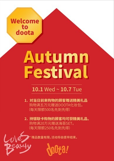 5만 원 이상 구매 시 두타파우치를 일별 선착순 500개 한정으로 증정하며, 중국 은련카드(Union Pay International)로 20만 원 이상 구매한 시 김 세트를 일별 선착순 250개 한정으로 증정한다.