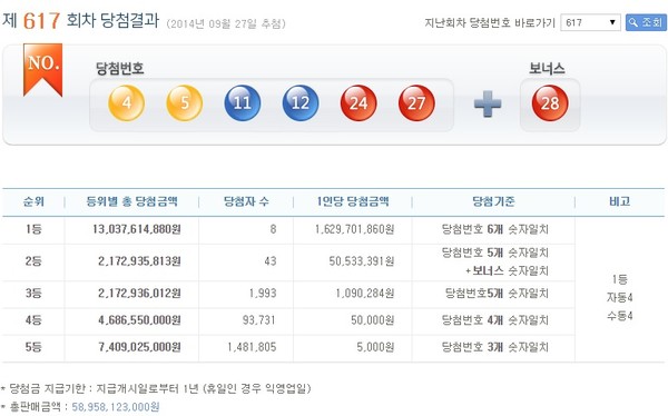 2014년 9월 27일 실시된 제617회 나눔로또 1등 당첨번호는 '4, 5, 11, 12, 24, 27'이며, 2등 보너스 번호는 28번이다.이번 로또 617회차 추첨 결과 1등 당첨자는 8명으로 16억2970만1860원의 당첨금을 받게 됐다.1등 번호 중개와 보너스 번호를 맞힌 2등은 43명이며, 1인당 5053만3391원씩 지급받는다. 당첨번호 중 5개를 맞힌 3등은 1993명으로 당첨금은 각 109만284원이다.5만원의 당첨금을 받는 4개의 번호를 맞힌 4등은 9만3731명이며, 5000원의 고정 당첨금을 받는 5등은 148만1805명이 나온 것으로 집계됐다.한편, 이번주 로또617 총 판매금액은 589억5812만3000원이다.[로또617회당첨번호, 사진=로또 홈페이지 캡처]