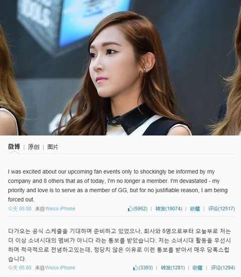 이날 제시카는 자신의 웨이보 (중국 SNS)에 "다가오는 공식 스케줄을 기대하며 준비하고 있었으나 회사와 (다른 멤버) 8명으로부터 '오늘부로 너는 더 이상 소녀시대의 멤버가 아니다'라는 통보를 받았다"는 취지의 글을 올렸다. 그는 이어 "저는 소녀시대 활동을 우선시하며 적극적으로 전념하고 있는데 정당치 않은 이유로 이런 통보를 받아서 매우 당혹스럽다"고 덧붙였다.