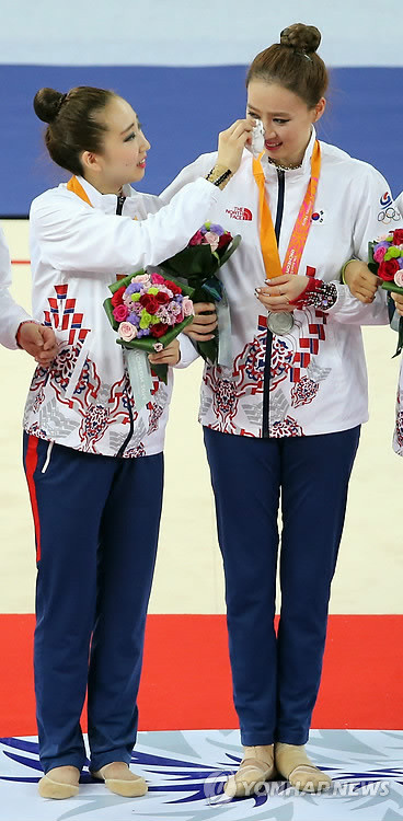 【뉴데일리 스포츠】리듬체조 대표팀의 맏언니 김윤희(23·인천시청)가 눈물을 보였다.손연재와 김윤희, 이다애, 이나경이 모인 한국 여자 리듬체조 대표팀은 지난 1일 인천 남동체육관에서 열린 단체전에서 164.046점을 기록하며 값진 은메달을 따냈다.이는 리듬체조 역사상 최초의 은메달이다. 한국은 1997 방콕대회와 2002 부산대회에서 2회 연속 단체전에서 동메달을 획득한 바 있다.이날 리듬체조 김윤희는 첫 번째 종목인 볼과 두 번째 종목인 후프에서 실수를 저지르며 목표였던 16점대에 못미친 15.083점을 받았다. 이에 김윤희는 눈물을 흘렸고, 이후 마음을 다잡은 그녀는 리본에서 16.183점, 곤봉에서는 자신의 최고점 16.416점을 받으며 뒷심을 발휘했다.경기 후 김윤희는 "다 같이 열심히 준비했는데, 볼과 후프에서 잘하다가 마지막에 실수해서 동생들에게 피해가 갈까봐 눈물이 났다. 동생들에게 미안해서.."라고 눈물을 흘린 이유를 털어놨다.한편, 이날 김윤희는 왼쪽 발목과 무릎의 부상에도 불구하고 투혼을 발휘, 4종목 합계 47.765점을 받으며 9위로 개인종합 결승에 진출했다. 김윤희는 손연재와 함께 2일 열리는 개인종합 결선에 나선다.[리듬체조 김윤희 눈물을 닦아주는 이다애, 사진=연합뉴스]