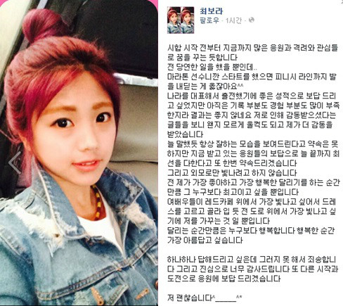 투혼의 완주를 선보인 최보라(23·경주시청)는 선수가 경기 이후 쏟아진 관심에 감사인사를 전했다.최보라는 3일 자신의 페이스북에 "시합 시작 전부터 지금까지 많은 응원과 격려와 관심들로 꿈을 꾸는 듯합니다. 전 당연한 일을 했을 뿐인데.."라고 운을 뗐다.그녀는 "마라톤 선수니깐 스타트를 했으면 피니시 라인까지 발을 내딛는 게 옳잖아요. 나라를 대표해서 출전했기에 좋은 성적으로 보답 드리고 싶었지만 아직은 기록 부분도 경험 부분도 많이 부족한지라 결과는 좋지 않네요. 저로 인해 감동받았다는 글을 보니 왠지 울컥하고 제가 더 감동받았습니다"고 밝혔다.이어 "늘 말했듯 항상 잘하는 모습을 보여드린다고 약속은 못하지만 지금 받고 있는 응원들의 보답으로 늘 끝까지 최선을 다한다고 또 한번 약속드리겠습니다"라고 덧붙였다.마지막으로 최보라는 "외모로만 빛나려고 하지 않습니다. 여배우들이 레드카페 위에서 가장 빛나고 싶어서 드레스를 고르고 골라 입 듯 전 도로 위에서 가장 빛나고 싶기에 저를 가꾸는 것 일 뿐입이다"라며 "달리는 순간만큼은 누구보다 행복합니다. 행복한 순간 가장 아름답고 싶습니다"고 전했다.한편, 최보라는 지난 2일 열린 2014 인천 아시안게임 여자 마라톤에서 2시간45분4초를 기록하며 12위로 경기를 마쳤다. 이날 최보라는 결승선을 통과하자마자 바로 쓰러졌고, 다시 일어나지 못했다. 결국 그녀는 들것에 실려 도핑 테스트장으로 옮겨졌다. 개인 통산 8번째로 투혼의 완주였다.[최보라 감사인사, 사진=최보라 페이스북]