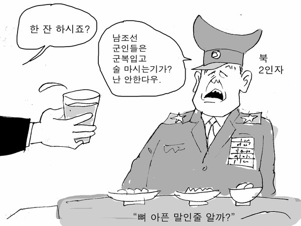 만평 팽팽한 기싸움 중 뼈 아픈 한 마디..