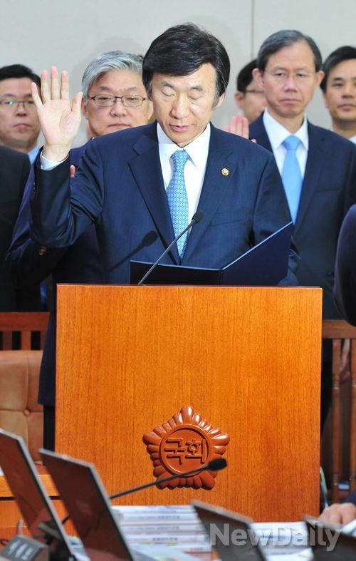 [윤병세] 외교부 장관이 7일 오전 서울 여의도 국회 외교통상위 회의실에서 열린 국정감사에서 관계자들과 증인선서를 하고 있다.