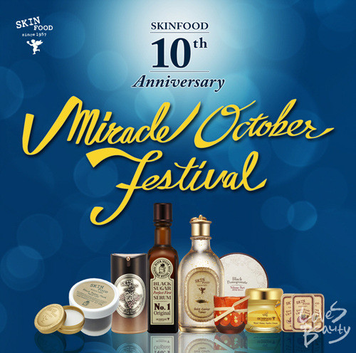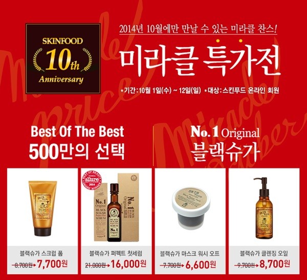[노세일 정책]을 고수해오던 <스킨푸드>가 최초로 제품 할인 행사를 실시해 관심을 모으고 있다.스킨푸드는 오는 10월 26일까지 브랜드 탄생 10주년을 기념해 온오프라인 모든 채널을 통해 <미라클 옥토버 페스티벌(Miracle October Festival)>을 진행한다.대상품목은 소비자가 뽑은 스킨푸드 10종의 스테디셀러이며(스킨푸드 멤버십 회원 한정, 아이템은 기간별 상이) 10월 1주차에는 스킨푸드의 대표 라인인 [블랙슈가] 4종(블랙슈가 마스크 워시 오프·블랙슈가 퍼펙트 첫세럼·블랙슈가 클렌징 오일·블랙슈가 스크럽 폼)을, 2·3주차에는 고객들이 직접 뽑은 스킨푸드 기초와 색조 베스트 탑 10을 특가에 만나볼 수 있다.