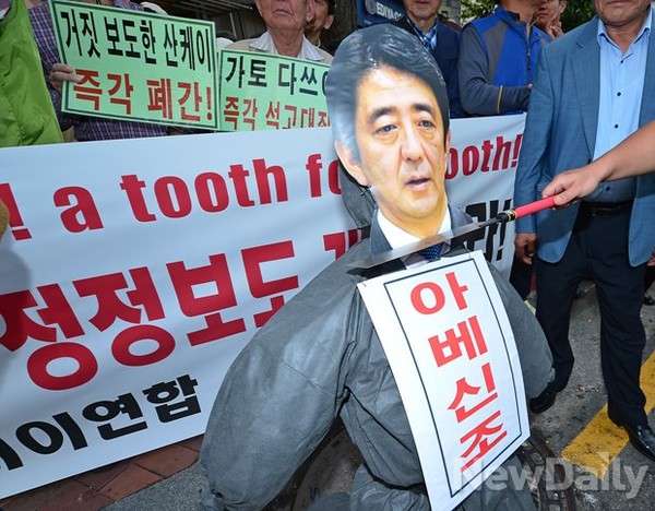 대한민국어버이연합과 한겨레청년단을 비롯한 애국단체가 8일 오후 서울 중구에 위치한 일본 산케이신문 서울사무소를 찾아 [허위 사실을 보도한 산케이 즉각 사과! 정정보도]를 요구하는 기자회견을 가졌다.