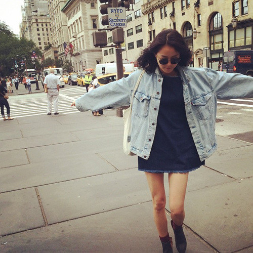 데님소재 미니드레스와 박시한 데님 재킷 등 빈티지 스타일링 눈길
