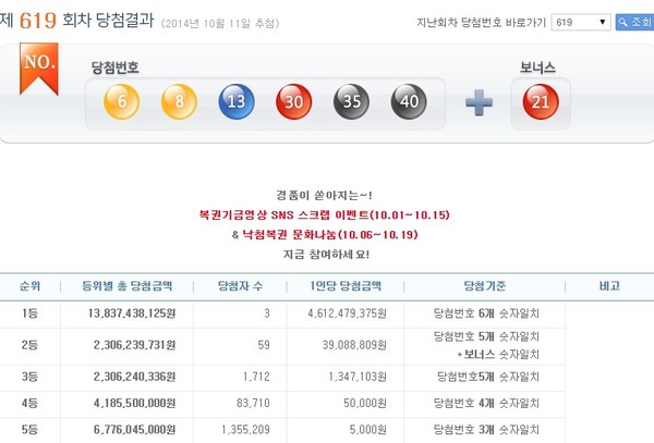 2014년 10월 11일 실시된 제619회 나눔로또 1등 당첨번호는 '6, 8, 13, 30, 35, 40'이며, 2등 보너스 번호는 21번이다.이번 로또 619회차 추첨 결과 1등 당첨자는 3명으로 46억1247만9375원의 당첨금을 받게 됐다.1등 번호 중개와 보너스 번호를 맞힌 2등은 59명이며, 1인당 3908만8809원씩 지급받는다. 당첨번호 중 5개를 맞힌 3등은 1712명으로 당첨금은 각 134만7103원이다.5만원의 당첨금을 받는 4개의 번호를 맞힌 4등은 8만3710명이며, 5000원의 고정 당첨금을 받는 5등은 135만5209명이 나온 것으로 집계됐다.한편, 이번주 로또619 총 판매금액은 588억2292만5000원이다. 로또 618회 당첨번호[로또619회당첨번호, 사진=로또 홈페이지 캡처]