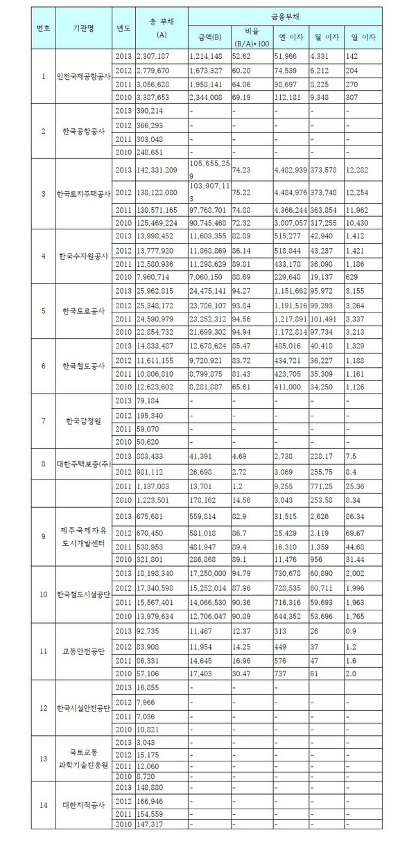 특히 인천국제공항공사, 한국감정원, 대한주택보증, 한국시설안전공단, 국토진흥원, 대한지적공사 등 6개 기관을 제외한 8개 기관은 4년 연속 부채가 늘고 있는 것으로 나타났다.