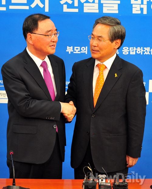 [정홍원] 국무총리가 13일 오전 서울 여의도 국회 새정치민주연합 원내대표실에서 [우윤근] 원내대표를 예방 하고 있다.