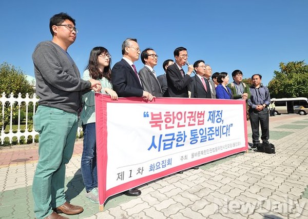• 북한인권 시민단체들이 북한인권법 제정을 위해 14일 오전 서울 여의도 국회앞에서 기자회견을 열고 매주 화요일마다 국회 정문 앞에서 집회를 갖기로 했다.