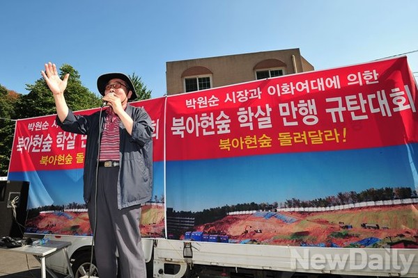 국민행동본부가 14일 오후 서울 서대문구 신촌동에 위치한 이화여대 산학협력관 앞에서 북아현숲 학살 현장 규탄 기자화견을 열었다.