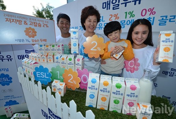 매일우유가 지방은 낮추고 칼슘을 높인 [저지방&고칼슘2%] 출시 행사를 15일 오전 서울 더케이트윈타워 풀바셋 앞에서 진행했다. [저지방&고칼슘2%]라인은 4가지로 세분화해 몸과 나이에 맞춰 골라먹기 쉽게했다.