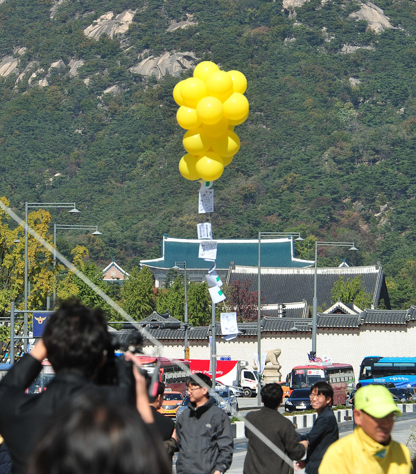 정의당 [천호선] 대표와 [노회찬] 전 대표 등 정의당 당직자들이 16일 오전 11시 50분 서울 광화문 세종대왕 동상 앞에서 [IT 민주화]를 위한 삐라 살포 기자회견을 진행했다.