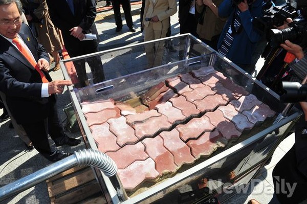 새정치민주연합 환경노동위원회 소속 의원들이 16일 오후 여의도 국회의사당 본청 앞에서 노후 상-하수도관 누수에 의한 토사 유출, 지반침하 싱크홀 모형실험을 하고 있다.