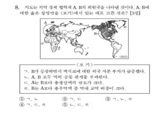 앞서 수험생들은 평가원이 세계지리 8번 문항에서 'EU가 NAFTA보다 총생산액의 규모가 크다'는 보기 ㉢이 맞는 설명이라고 보고 수능 등급을 매기자 문제 자체에 오류가 있다며 등급 결정을 취소하라는 소송을 제기했다.
