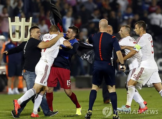 세르비아 선수가 드론에 매달린 깃발을 떼어내자 알바니아 선수가 달려들어 몸싸움을 펼쳤고, 이에 흥분한 세르비아 관중이 경기장에 몰려와 알바니아 선수들을 폭행했다.