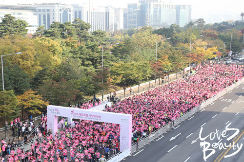 유방건강에 관한 유용한 정보를 제공하고, 자가 검진의 중요성을 알리기 위해 <아모레퍼시픽(대표이사 서경배)>이 주관하고 <한국유방건강재단(이사장 노동영)>이 주최한 [2014 핑크리본 사랑마라톤 서울대회]가 지난 19일 오전 여의도공원에서 성황리에 개최됐다.[핑크리본 사랑마라톤]은 우리나라 여성암 1위인 유방암 관리에 대한 경각심을 일깨우고, 유방건강의 중요성에 대한 의식을 높이고자 연중 진행되는 아모레퍼시픽 핑크리본캠페인의 대표적인 행사다.[10월 유방건강의 달]을 맞아 1만여 명의 시민들과 오늘 오전 서울 여의도 일대를 핑크빛으로 물들임으로써 국내 최대 핑크리본 축제의 장인 서울대회를 성료했다. -