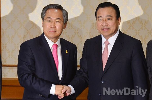 [포토] 악수 나누는 '이완구-우윤근' 여야 원내대표