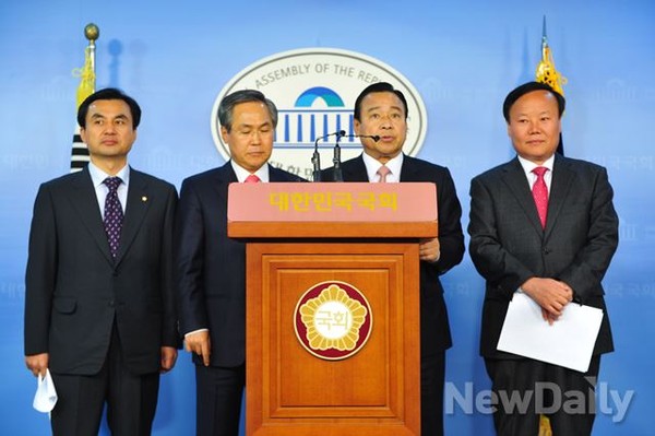 새누리당 이완구 원내대표와 새정치민주연합 우윤근 원내대표가 21일 오전 여의도 국회 정론관에서 주례회동을 결과를 브리핑 하고 있다.*********************