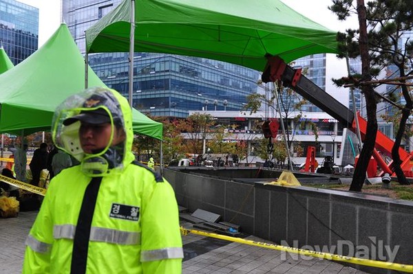 • 성남 판교테크노밸리 환풍구 추락사고를 조사 중인 국립 과학수사연구원이 21일 오후 분당구 삼평동 참사 현장에서 환풍구와 지지대에 대한 하중 실험을 실시하고 있다.