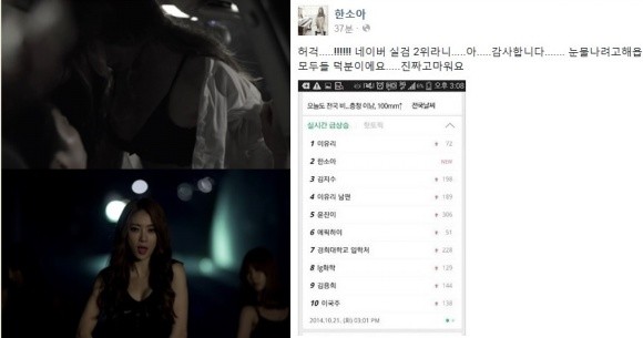 한소아가 포털사이트 실시간 검색어에 이름을 올린 소감을 밝혔다.한소아는 21일 자신의 페이스북에 "허걱, 네이버 실검 2위라니… 아 감사합니다"라며 "눈물 나려고 해요. 모두들 덕분이에요. 진짜 고마워요"라는 글과 함께 자신의 이름이 검색어 순위 2위에 등극한 캡처 사진을 게재했다.제이큐(JQ)&한소아의 '블랙앤화이트 스토리(Black&White Story)'의 두 번째 에피소드 '눈엔눈 이에는 이' 뮤직비디오를 공개했다. 신곡 '눈엔눈 이에는 이'는 제이큐가 작곡했으며, 한소아가 직접 복수심에 불타는 여자의 마음을 가사로 표현했다.공개된 뮤비 속 한소아는 자기를 외면한 남자에게 복수를 하기 위해 다른 남자와 차 안에서 사랑을 나누고 있다. 운전석에 짧은 치마를 입고 있던 한소아는 S라인의 몸매를 자랑하며 남자 위에 올라가 셔츠를 벗는 도발적인 모습을 보였다.마지막 장면에는 브래지어의 끈을 풀어헤치는 파격적인 행동을 보였다. 특히, 가슴이 드러나는 블랙 의상을 입고 엉덩이를 흔드는 자극적인 안무가 인상적이다.한편, 제이큐와 한소아는 콘셉트형 스토리텔링 앨범인 '블랙앤화이트 스토리(Black&White Story)' 프로젝트를 이어 나갈 예정이다.[한소아, 사진='눈엔눈 이에는 이' 뮤직비디오/ 한소아 페이스북 캡처]