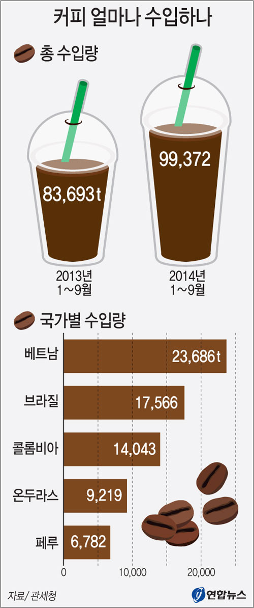 올해 한국의 커피 수입량이 사상 최대치를 기록할 것으로 보인다.관세청 수출입무역통계 에 따르면 올해 1∼9월 생두와 원두 등 커피 수입중량은 9만9천372톤으로 지난해 같은 기간보다 18.7% 증가했다.무엇보다 올해 커피 수입중량은 1990년 이후 가장 많은 양이 수입됐던 2011년 같은 기간의 9만 2천 톤을 넘어서며 최대 기록을 경신할 전망이다.국가별로 보면 베트남이 수입 규모가 가장 컸고, 브라질과 콜롬비아, 온두라스, 페루 등 중남미 국가들이 그 뒤를 이었다.커피 수입금액은 올해 총 3억 8천200만 달러로 지난해 같은 기간 3억 1천500달러보다 21.2% 늘었다. 하지만 커피 수입에서 큰 비중을 차지하는 생두 가격이 2012년 이후 안정세를 보이며 2011년 같은 기간보다 수입금액은 줄었다.업계에서 커비 수입량이 늘어난 것은 최근 프랜차이즈 커피 전문점이 급격하게 확산하면서 커피 소비량도 늘었기 때문으로 분석하고 있다.[커피 수입량 사상 최대, 사진=연합뉴스]