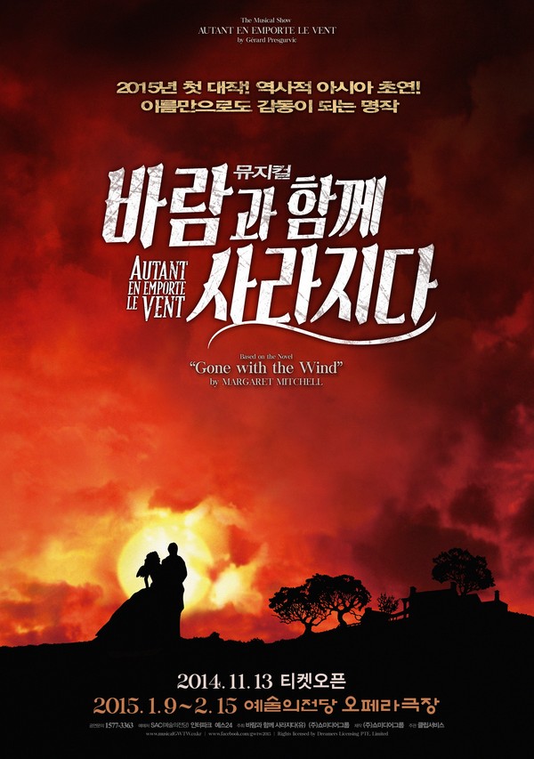 한국에서의 아시아 초연을 성사시키기 위해 프랑스 제작자, 미국 원작자 저작권 관리 협회와의 협의 끝에 드디어 원작 탄생 80주년, 영화 탄생 77주년을 맞는 기념비적인 해 2015년에 한국 관객들과 만나게 된 것. 단 5주간의 진귀한 경험을 선사할 뮤지컬 '바람과 함께 사라지다'는 11월 13일(목) 오후 2시 첫 티켓을 오픈하며 2015년의 포문을 열 예정이다.