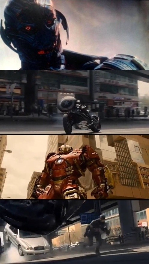 '어벤져스2' 예고편은 파괴돼가는 도시에서 시민들이 탈출하는 장면으로 시작하고, 잠시 후 캡틴 아메리카와 호크아이, 토르가 차례로 등장한다. 또, 절벽을 기어 오르는 울트론 군단의 모습도 눈에 띈다.