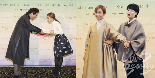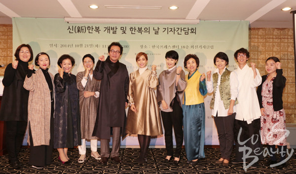 <문화체육관광부(장관 김종덕)>와 <한국공예·디자인문화진흥원 부설 한복진흥센터(센터장 최정철)>가 21일 오전 11시 서울 프레스센터에서 [신(新)한복 개발 및 한복의 날] 기자간담회를 개최했다.이번 기자간담회는 최정철 한복진흥센터장을 비롯해 서영희 예술감독, 참여 디자이너 등이 참석한 가운데 신 한복 개발 프로젝트의 대표적인 결과물 공개와 한복의 날 행사에 대해 소개하는 시간으로 채워졌다.한복진흥센터에서 추진하는 [신 한복 개발 프로젝트]는 한복의 불편함을 개선하고 일상 속에서도 입을 수 있는 한복을 제안하는 사업으로 문쌍후, 오인경, 유현화, 이혜미, 조영기, 조옥란, 김영진, 황선태 총 8명의 디자이너가 참여해 각각 8벌씩 총 64벌의 신 한복을 개발했다.이 날 직접 신 한복을 입고 온 최정철 센터장은 “한복에 대한 인식 설문 결과 많은 사람들이 한복의 단아함과 소재의 화사함에 대해 매력은 느끼지만 쉽게 입기 불편한 옷이라는 생각을 갖고 있는 것으로 조사됐다”며, “이번 신 한복 개발 프로젝트는 4개월 동안 [대중들이 입고 싶어하는 한복]을 만들기 위해 누구나 쉽고 편하게 입을 수 있는 디자인을 염두에 두고 진행했다”고 프로젝트의 취지를 밝혔다.또한 “얼마 전 직접 신 한복을 입고 서울패션위크에 참석했었는데 홍콩 언론에서 취재하는 등 많은 관심을 받았다”고 덧붙였다.이어서 서영희 예술감독은 8명의 디자이너와 함께 개발한 신 한복의 콘셉트와 주안점에 대해 전하며, 오는 25일과 26일 이틀간 진행될 한복의 날 행사에서 공식적으로 발표 예정인 신 한복 중 일부를 미리 공개했다.서영희 감독은 “이번 신 한복 프로젝트는 한복의 원형을 지키면서도 현대인들의 감성에 맞는 한복을 만들고 디자이너의 개성을 통해 다양성을 주고자 했다”며, “신 한복을 통해 한복은 불편하다는 인식이 바뀔 수 있으면 좋겠다”고 말했다.더불어 이번 프로젝트에 참여한 조옥란 디자이너는 “전철과 비행기를 타는 시대에 가마를 타던 시대의 옷을 입어야 한다고 외치는 것은 공허한 메아리에 불과하다”며, “비행기를 타는 시대에 맞는 우리 옷이 필요하다”고 프로젝트에 참여하는 소감을 전했다.이날 간담회에서는 한복 홍보대사로 선정될 배우 이유리의 신 한복 시착식도 진행됐다.이유리는 신 한복 개발 프로젝트의 결과물 중 하나를 직접 입어보며 “아름다운 한복을 입혀주시니 감사하고 기분이 좋다”며, “연기를 하다보면 옷 역시 캐릭터 표현의 한 부분이 될 수 있는데 한복의 선이나 디자인이 많이 알려져 표현의 다양성에 도움이 되면 좋겠다”고 한복 홍보대사로 선정된 소감을 전했다.또한 이유리는 한복진흥센터가 연말까지 추진할 예정인 [신 한복 릴레이]의 첫 주자로서 다음 주자로는 평소 절친한 배우 최강희와 MBC 주말드라마 <왔다! 장보리>에서 함께 열연했던 배우 성혁을 추천했다.신 한복 릴레이는 입어봐야 느낄 수 있는 옷의 경험적인 성격을 고려해 진행되는 프로젝트로 참여자들이 신 한복을 직접 입어보고 또 한복을 입혀보고 싶은 사람을 다음 주자로 추천하는 것이다.서영희 감독은 “신 한복 릴레이 외에도 팝업스토어를 통해 한복에 대한 사람들의 반응을 알아보는 등 다양한 프로젝트를 진행할 예정”이라며, “한복에 대한 인식 개선이 목표이기 때문에 아직 판매 단계는 아니지만 차후 판매가 된다면 신 한복의 가격은 최대 30만 원대가 될 것으로 예상한다”고 전했다.한편 [2014 한복의 날] 행사는 오는 25일과 26일 이틀간 문화역서울 284에서 개최되며 한복 홍보대사 위촉식과 함께 신 한복 패션쇼, 한복 댄스파티 등 다양한 연령층이 참여할 수 있는 한복 놀이문화의 장으로 개최된다.[사진 = 한복진흥센터, 러브즈뷰티 DB]
