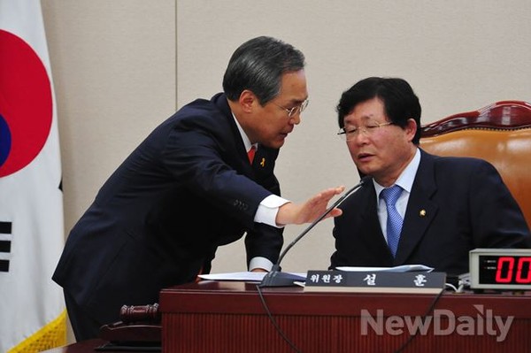 [설훈] 교육문화체육관광위원장이 23일 오전 서울 여의도 국회에서 열린 교육문화체육관광위원회의 국립대학에 대한 국정감사에서 새정치민주연합 우윤근 원내대표와 대화를 나누고 있다.