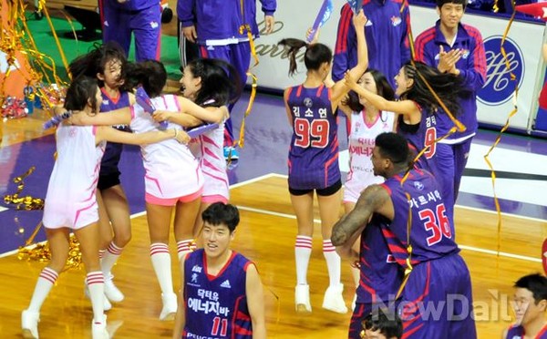 23일 고양실내체육관에서 열린 '2014-2015 KCC프로농구' 고양 오리온스와 인천 전자랜드의 경기에서 오리온스가 짜릿한 역전 승을 하고 환호 하고 있다.