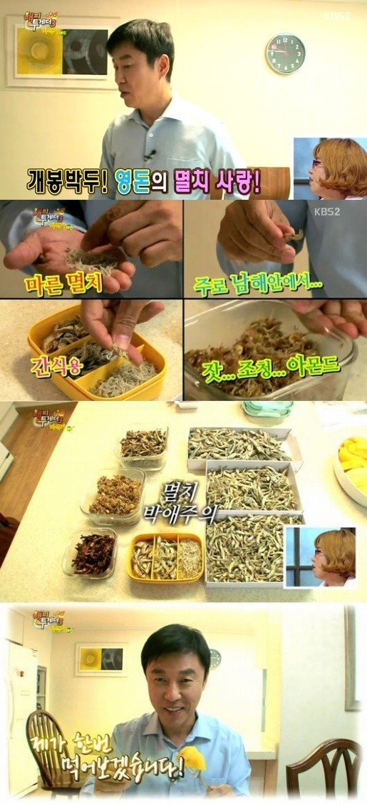 이영돈 PD가 유별난 멸치사랑을 드러냈다.지난 23일 방송된 KBS 2TV '해피투게더3'는 '미식가 특집'으로 꾸며져지며 이영돈 PD, 농구선수 서장훈, 요리사 레이먼킴, 방송인 사유리가 출연해 솔직한 입담을 뽐냈다.이날 '해피투게더' 이영돈 PD는 "멸치를 좋아한다"라며 평소 즐겨먹는 다양한 멸친 반찬을 공개해 눈길을 끌었다.이영돈 PD가 직접 집에서 찍은 VCR 영상을 통해 그는 "멸치가 한 종류만 있는 것이 아니다. 약간 작은 멸치는 정말 고소하다. 그리고 내가 제일 즐겨먹는 중간 사이즈의 멸치, 그리고 다시멸치 등이 있다"고 설명했다.이어 "하루에 50마리에서 100마리 정도 먹는다"며 "다른 것에 비해 씹히는 맛이 좋다. 그래서 고발 프로그램을 많이 하는지.."라며 농담을 던쳐 웃음을 자아냈다.['해피투게더' 이영돈 멸치사랑, 사진=KBS2 '해피투게더' 방송 캡처]