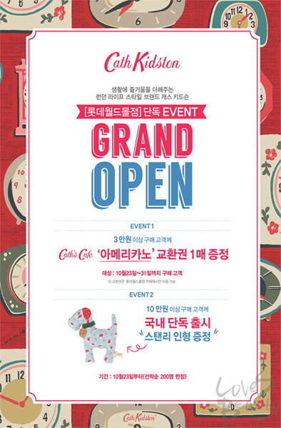 런던 라이프 스타일 브랜드 <캐스 키드슨(Cath Kidston)>이 캐스 키드슨과 캐스 카페(Cath's cafe)가 결합된 복합매장을 잠실 롯데월드몰에 오픈했다.잠실 롯데월드몰점은 캐스 키드슨의 제품을 구입할 수 있는 것은 물론, 캐스 키드슨의 브랜드 카페인 <캐스 카페>를 한 곳에서 만나볼 수 있는 매장이다. 캐스 카페는 영국 홈메이드 스타일의 메뉴와 음료를 맛볼 수 있는 공간이다.이에 따라 캐스 키드슨은 롯데월드몰점 오픈 기념, 다채로운 이벤트를 진행한다.오는 30일까지 정상가 대비 최대 50%까지 저렴한 특가상품들을 만나볼 수 있으며, 10만원 이상 구매고객에게는 캐스 키드슨 코리아에서 제작한 스탠리 인형을 증정할 예정이다(200개 한정, 모든 행사는 재고 소진 시 조기 종료).또한 오픈 일부터 소진 시까지 금액에 상관없이 구매 고객 모두에게 풍선과 캐스 카페의 [넛츠 앤 베리즈] 낱개 제품을 증정하며, 31일까지 3만원 이상 구매고객에게는 롯데월드몰점 캐스 카페에서 이용할 수 있는 아메리카노 교환권을 증정한다.[사진 = 캐스 키드슨]