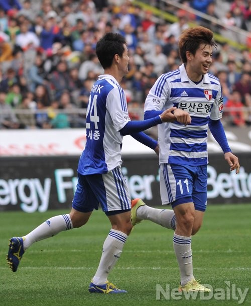 FC서울 VS 부산 아이파크 경기에서 전반 39분 부산 아이파크 11번 임상협 선수가 FC서울을 상대로선제골을 넣고 환호 하고 있다.