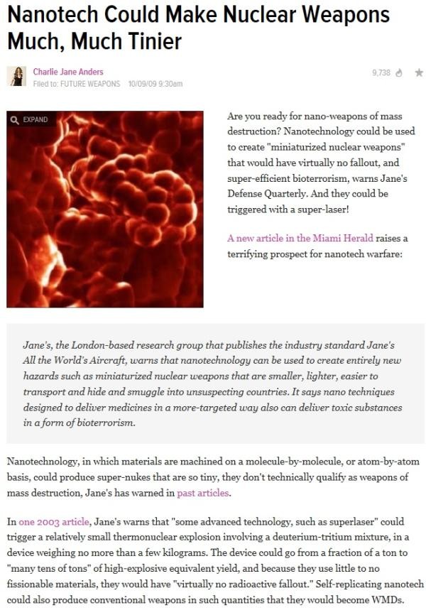 일례로 오는 2015년에는 경계·대공방호·정찰·정보통신 등에 나노기술이 실용화되어 방어형 나노무기가 실전에 투입될 전망이며, 2025년에는 ‘공격형 나노무기’ 대 ‘방어형 나노무기’의 교전이 예상될 것이라고 예측했다(인용: 김용, <나노기술(NT)의 군사 분야 적용> 이영주, <2025년 강력한 인공지능 '나노무기' 등>).