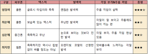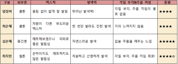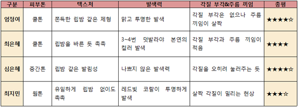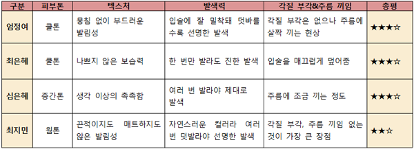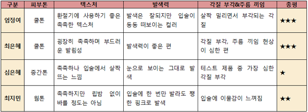[텍스처] 촉촉하고 발림성이 좋아 마치 립밤을 바르는 것 같았다.[발색력] 립밤 같은 느낌이라 발색이 잘 안될 줄 알았는데 발색도 나쁘지 않았다.[각질 부각&주름 끼임] 주름 끼임이 전혀 없었으며 각질도 오히려 눌러주는 느낌.[지속력] 지속력은 테스트 제품 중 가장 떨어졌다. 촉촉한 제품은 어쩔 수 없는 듯.[총평]테스트할 때 상당히 마음에 들었던 제품이라 재구매 의사도 있다. 일단 텍스처가 촉촉해서 좋았으며 발색도 잘됐고 각질 부각과 주름 끼임이 전혀 없었다. 다만 촉촉한 만큼 지속력은 살짝 떨어지는 느낌이었다. 깔끔한 패키지 디자인도 마음에 든다.[만족도] ★★★★☆■ 최지민 기자(20대 중반, 웜톤, 평소 립밤을 생활화해 입술 각질이 적음, 입술 색은 조금 어두운 편)