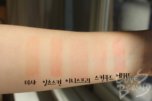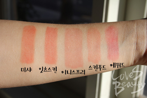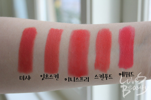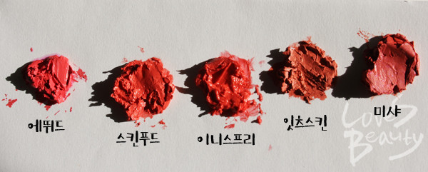 [텍스처] 텍스처나 사용감 면에서 잇츠스킨과 가장 비슷하다. 끈적이지도 매트하지도 않은 발림성.[발색력] 잇츠스킨보다 좀 더 핑크빛이 도는 무난한 코랄. 색상이 워낙 자연스러워 그런지 제대로 발색하려면 꽤 많이 덧발라야 한다.[각질 부각&주름 끼임] 다른 부분에서 별다른 매력을 느끼지 못했던 미샤 제품의 가장 큰 장점은 각질 부각과 주름 끼임 현상이 없었다는 것.[지속력] 입술에 잘 밀착돼 지속력은 나쁘지 않다.[총평]너무 만족스러웠던 잇츠스킨 제품과 사용감은 가장 비슷했지만 컬러가 아쉽다. 요즘은 워낙 립 제품 종류가 다양한 만큼 개인적으로 립스틱이라면 자연스러워도 컬러감이 또렷한 제품이 매력적이라는 생각이다. 워낙 비비드한 컬러가 트렌드이기도 하지만 이 정도의 코랄 컬러는 더 저렴한 다른 류의 립 제품으로도 충분히 연출할 수 있다.분명 누구나 쉽게 소화할 만한 자연스러운 컬러이지만 얼굴을 화사하게 보이게끔 하진 않는다.컬러가 특색 없다는 인상을 받았지만 발림성이나 사용감은 높은 점수를 얻을 만했다.[만족도] ★★☆[사진 = 러브즈뷰티 DB]
