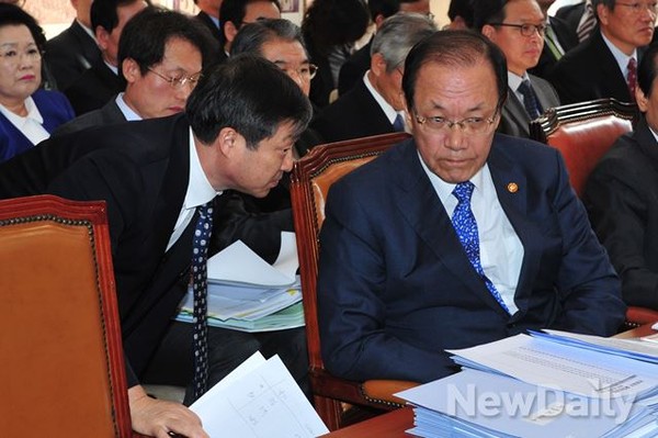 황우여 교육부 장관이 27일 여의도 국회의사당에서 열린 교육문화체육관광위원회의 교육부 소속기관 및 유관기관에 대한 국정감사에서 교육부 관계자와 대화를 나누고 있다.