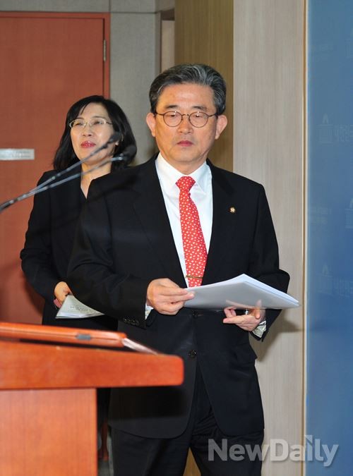 새누리당 이한구 공무원연금개혁 TF 팀장과 김현숙 의원이 27일 오후 여의도 국회의사당 정론관에서 기자회견을 갖고 공무원연금개혁안을 발표하기 위해 들어오고 있다.