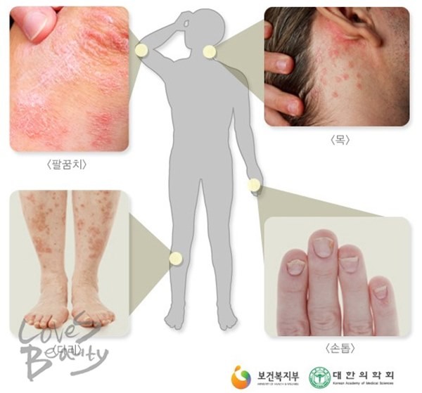 [건선]은 각질이 죽어 생기는 회백색 물질로 덮여있는 홍반성 피부 병변이 특징으로, 주로 팔꿈치, 무릎, 엉덩이, 두피 등 자극을 많이 받는 부위에서 발생한다. 피부 각질이 쉽게 벗겨져 나가며, 피부는 점차 두꺼워지고 가려움증, 습진과 같은 증상이 생긴다.