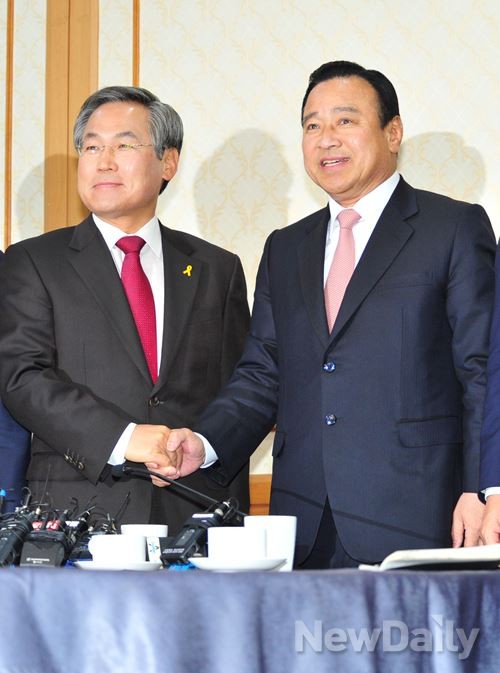 새누리당 이완구 원내대표가 28일 오전 서울 여의도 국회 귀빈식당에서 열린 여야 주례회동에서 새정치민주연합 우유근 원내대표와 악수를 나누고 있다.