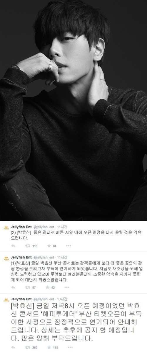 박효신 콘서트 '해피투게더' 부산 티켓 오픈이 연기됐다.박효신의 소속사 젤리피쉬 엔터테인먼트는 지난 29일 오후 공식 트위터를 통해 "10월 29일 오후 8시 오픈 예정이었던 박효신 콘서트 '해피투게더' 부산 티켓 오픈이 부득이한 사정으로 잠정적으로 연기됐다"고 알렸다.이어 "박효신 부산 콘서트는 관객들에게 보다 더 좋은 공연의 관람 환경을 드리고자 부득이 연기하게 됐다. 지금도 재조정을 위해 열심히 노력하고 있으며 무엇보다 여러분들과의 소중한 약속을 지키지 못하게 돼 대단히 죄송스럽다"고 사과의 뜻을 전했다.또한, 소속사는 "좋은 결과로 빠른 시일 내에 오픈 일정을 다시 올릴 것을 약속드린다"며 밝혔다.박효신 15주년 라이브 투어 '해피투게더'는 팬들의 성원에 공연을 전국으로 확대, 12월 13일과 14일 양일 펼쳐지는 서울 공연을 시작으로 12월 말까지 전국 4개 도시를 순회하며 공연하기로 했다.박효신은 12월 20일 광주를 시작으로 12월 24일 부산과 27일 대구, 31일 인천 공연을 확정지으며 전국 4개 도시에 라이브 투어를 펼칠 예정이다.[박효신 콘서트 연기, 사진=CJ E&M/ 젤리피쉬 엔터테인먼트 트위터 캡처]