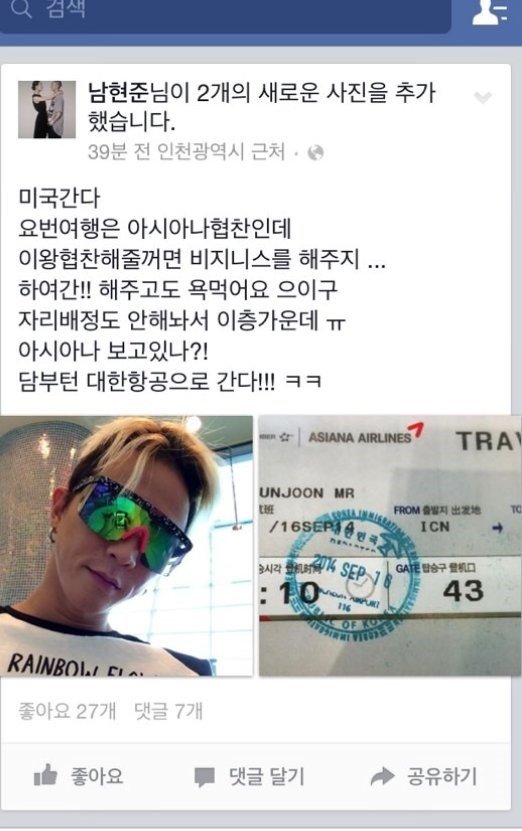 팝핀현준이 협찬 항공사에 불만을 표출한 사실이 뒤늦게 알려져 논란이 되고 있다.팝핀현준은 지난 9월 16일 자신의 페이스북에 "미국 간다. 이번 여행은 아시아나 협찬이다. 이왕 해줄 거면 비즈니스를 해주지. 하여간 해주고도 욕먹어요. 자리 배정도 안 해서 2층 가운데. 아시아나는 보고 있나? 다음부터 대한항공으로 간다"라는 글을 게재했다.해당 글은 현재 삭제된 상태지만 각종 온라인커뮤니티 등을 통해 캡처된 글이 급속도로 퍼지며 네티즌들의 비난을 받고 있다.네티즌들은 아시아나항공 로스앤젤레스행 항공권 금액이 약 203만으로 할인을 적용해도 177만원인데, 적지 않은 금액으로 협찬을 받았음에도 이를 불평한 팝핀현준의 무개념에 분노를 터뜨렸다.이에 대해 팝핀협준 소속사인 해피페이스 엔터테인먼트 관계자는 30일 "팝핀현준이 문제의 글을 적었던 것은 사실이지만 곧바로 삭제했다. 뒤늦게 화제가 돼 난처하다"고 밝혔다.[팝핀현준 항공권 협찬 불평, 사진=팝핀현준 페이스북 캡처]