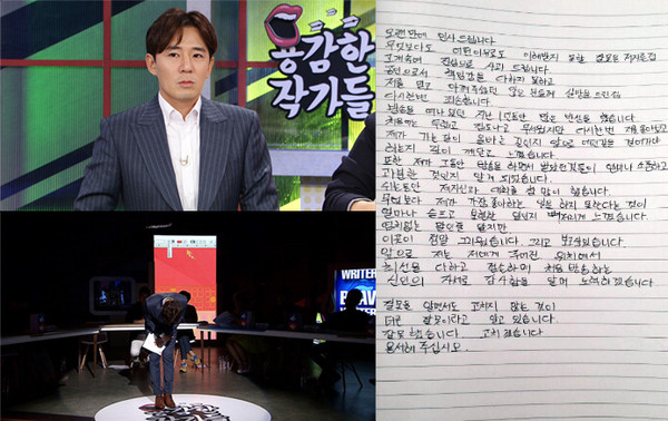 1년 만에 복귀한 방송인 붐의 대국민 사과 영상에 이어 '용감한 작가들' 제작진은 붐의 자필 사과문도 함께 공개했다.30일 첫 방송되는 E채널 '용감한 작가들' 1회 게스트로 지난해 불법 도박 사건 이후 1년 만에 복귀하는 붐이 출연한다. 방송 최초로 자숙기간의 심경 고백과 함께 대국민 사과로 대중 앞에 설 예정이다.방송에 앞서 E채널은 페이스북을 통해 붐이 직접 쓴 사과문을 읽어 내려가는 모습이 담긴 영상을 공개했다. 붐은 "어떤 이유로도 이해 받지 못할 잘못을 저지른 점 진심으로 사과 드린다"고 밝혔다.이어 "무엇보다 가장 좋아하는 일을 하지 못한다는 것이 얼마나 슬프고 불행한 일임을 뼈저리게 느끼고 많은 반성을 했다. 앞으로 주어진 위치에서 최선을 다하며 신인의 자세로 열심히 하겠다"고 장문의 사과문을 읽어 내려갔다.특히, 이전의 모습과 달리 매우 차분하고 수척한 모습으로 "염치없는 말이지만, 이곳이 정말 그리웠다"고 말한 붐은 녹화 당시에도 여론의 뭇매를 맞으면서 복귀를 하고 싶은 이유로 "못 견딜 것 같았다"고 솔직한 심경을 고백하며 용서를 구했다.또한, 녹화 중 당시 하차했던 라디오 프로그램 PD를 언급하며 자신으로 인해 피해를 입은 동료들에게 다시 한 번 미안함을 전했다. 특히, 부모님의 이야기에는 먹먹함을 내비치기도 했다.'용감한 작가들' 제작진은 "붐이 처음으로 대중 앞에 사과할 수 있는 기회라며 직접 써온 사과문을 읽었다"면서 "녹화현장에서 실시간으로 올라오는 기사에 대한 댓글을 출연진이 직접 읽어줬다. 본인 스스로도 조심스러워 하는 만큼 시청자분들도 마음을 열고 봐주셨으면 한다"고 말했다.30일 방송될 '용감한 작가들' 1회에는 '물의를 빚은 연예인의 복귀'를 주제로 게스트 붐의 복귀를 놓고 예능 작가들의 다양한 의견과 적나라한 질문이 쏟아진다.붐은 불법 도박 사건에 대한 사죄뿐만 아니라 자숙 기간 미모의 여성과의 한강 데이트 관련 기사 등 그를 둘러싼 소문과 진실에 대해서도 낱낱이 밝힌다. 또한, 붐의 복귀에 대한 작가들의 최종 선택과 그에 따른 솔루션이 공개될 예정이다.한편, '용감한 작가들'은 30일 본방송 중 문자투표를 통해 붐의 방송 복귀에 대한 시청자 의견을 받아 31일 E채널 홈페이지를 통해 결과가 공개된다. 30일 목요일 밤 11시 방송.<다음은 붐 자필 사과문 전문>오랜만에 인사 드립니다.무엇보다도 어떠한 이유로도 이해 받지 못할 잘못을 저지른 점 진심으로 사과 드립니다.공인으로서 책임감을 다하지 못하고저를 아껴주셨던 많은 분들께 실망을 드린 점 다시 한번 죄송합니다.방송을 떠나있던 지난 1년 동안 많은 반성을 했습니다.처음에는 두렵고 겁도 나고 무서웠지만 다시 한번 저를 돌아보고, 제가 가는 길이 올바른 길인지 앞으로 어떤 길을 걸어가야 하는지 깊이 깨닫고 느꼈습니다.또한 제가 그동안 방송을 하면서 받았던 것들이얼마나 소중하고 과분한 것인지 알게 되었습니다.쉬는 동안 제 자신과 대화를 참 많이 했습니다.무엇보다 제가 가장 좋아하는 일을 하지 못한다는 것이 얼마나 슬프고 불행한 일인지 뼈저리게 느꼈습니다.염치없는 말인 줄 알지만,이곳이 정말 그리웠습니다. 그리고 보고 싶었습니다.앞으로 저는 저에게 주어진 위치에서 최선을 다하고 겸손하며 처음 방송하는 신인의 자세로 감사함을 알며 노력하겠습니다.잘못을 알면서도 고치지 않는 것이 더 큰 잘못이라고 알고 있습니다.잘못했습니다. 고치겠습니다.용서해주십시오..