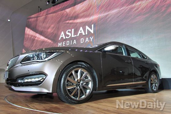 현대자동차가 30일 오전 서울 중구 동대문디자인플라자(DPP)에서 전륜구동 신형 대형 세단 '아슬란(ASLAN)의 신차발표회를 열고, 공식 출시했다.'아슬란'은 준대형급 세단으로 그랜저보다 큰 "3.0-3.3 리터 " 가솔린 엔진이 장착됐으며 전방 추돌 경보장치(FCWS) 및 차선이탈 경보장치(LDWS), 후측방 경보장치(BSD), HUD(헤드업 디스플레이)가 장착돼 안전 전과 편의성을 동시에 가졌는 평을 듣고 있다.한편 아슬란 은 터키어로 사자라는 뜻을 기자고 있으며 지난 5월 부산 모터쇼에서 프로젝트명 AG로 먼저 공개됐다.