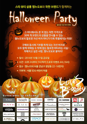 청담동 토털 뷰티 살롱 <엠누오보>가 10월 31일 살롱에서 [할로윈 바자 파티]를 연다.엠누오보의 할로윈 바자 파티는 조금 특별하다. 본래 어린이들이 주인공이 되어 적극 참여하는 날인 할로윈의 특성을 살려 [서울 SOS 어린이 마을]을 위한 기부 행사로 기획된 것.이번 행사의 수익금은 모두 어린이들을 위해 기부된다. 모든 브랜드 제품은 시중가보다 낮은 가격으로 판매되며 제품을 구입하는 동시에 기부도 할 수 있는 알찬 이벤트가 될 것으로 보인다.이번 행사를 앞두고 많은 스타들이 “어린이들을 돕는 행사라고 하니 큰 관심이 생겼다”, “수익금이 꼭 어린이들에게 큰 힘이 되었으면 좋겠다”고 전했다.배우 박해진은 선뜻 제품 기부 의사를 밝혔으며, 배우 하연수와 심은경 역시 따뜻한 취지로 기획된 행사라는 점에 주목하며 응원의 메시지를 보내왔다. 그 밖에도 선미, 핫펠트(예은), 신소율, 15&와 갓세븐까지 응원 메시지를 전하며 행사의 의미를 되새겼다.특히 이번 행사에는 스타들뿐만 아니라 뷰티, 패션업계의 다양한 브랜드들이 동참해 눈길을 끈다.코스메틱 브랜드인 안나수이, 바비브라운, 메이크업포에버, 베네피트, 아베다, 시세이도, 유리아쥬, 눅스, 슈에무라, 코스메데코르테, 로레알, 알엠케이, 케이트, 어퓨부터 나무하나, 드하모니, 아크부아노, 비엘타, 엘비나룸, 스테레오 바이널즈, 매지클라우드, 언더클래식과 같은 패션 브랜드까지 20개가 넘는 브랜드들을 만나볼 수 있다.여기에 컴피테라피, 민스 키친, 룸앤소, 마시멜로 피부과와 수 한의원 및 탠캘리포니아 상품권까지 방문객들을 기다린다.또한 마실 거리인 싸우씨 아이리쉬 레드 에일 맥주와 일리 커피까지 함께해 행사장은 더욱 풍성해질 것으로 기대된다.개최 시작 시간인 2시부터 저녁 7시까지 엠누오보를 찾는 모든 방문객을 대상으로 하는 럭키 드로우 이벤트 및 다양한 이벤트가 준비되어 있는 이번 행사는 누구나 참여 가능하다.[사진 = 엠누오보]